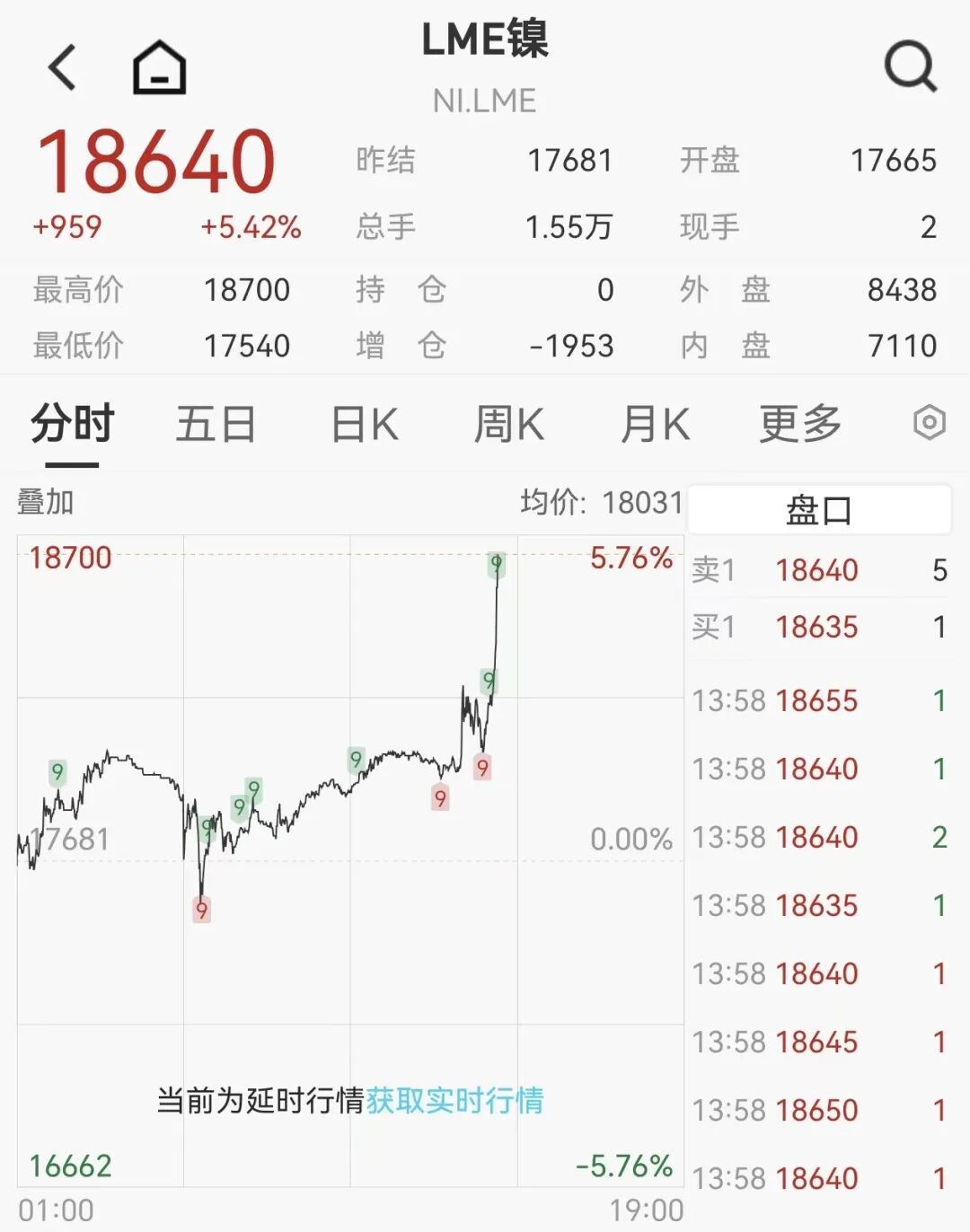 “妖镍”再发力。沪镍期货主力合约一度拉升超7%,LME镍直线拉升超5%。