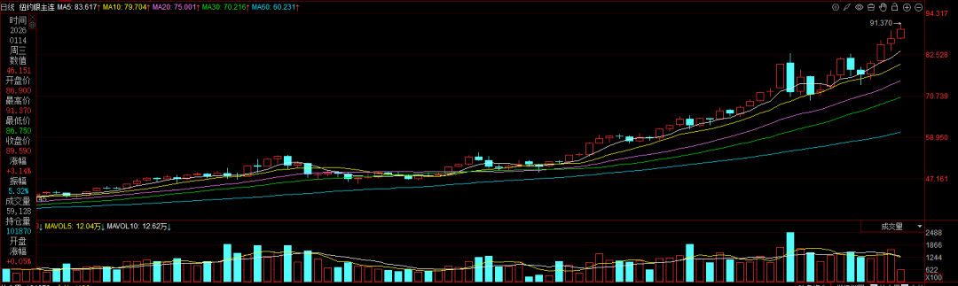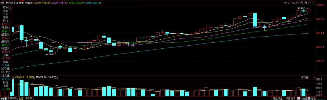 值得一提的是,截至发稿,金银价格再次集体上涨,COMEX黄金期货价格最高触及4647.6美元/盎司,再创历史新高;COMEX白银期货价格最高触及91.37美元/盎司,涨幅超3.5%,再创历史新高;沪银期货主力合约涨幅超过8%。