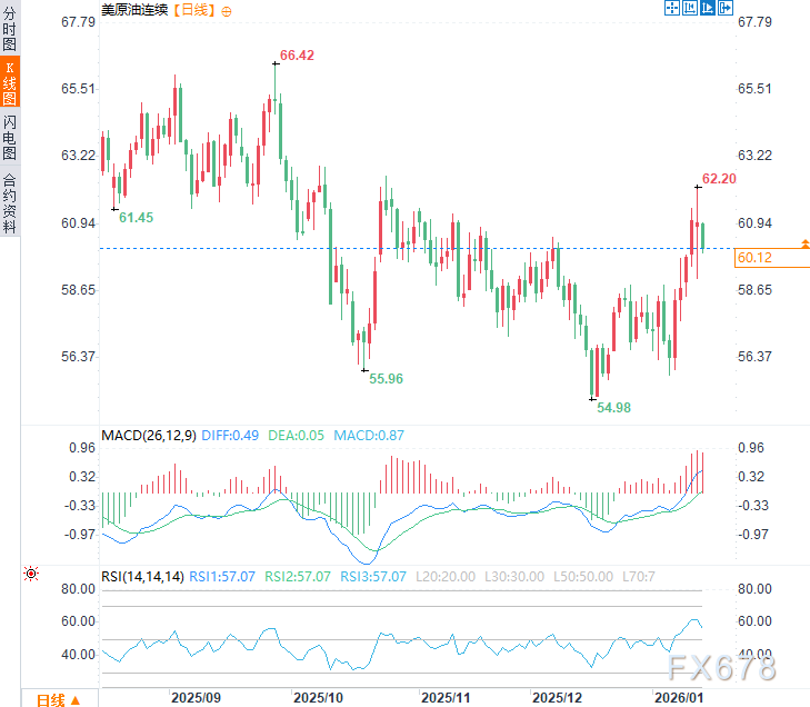 周四亚市时段,原油价格震荡下行,一度下跌逾3%至59.93美元/桶;周三油价一度升至3个月高点62.20美元/桶,日内振幅逾5.11%,波动显著。