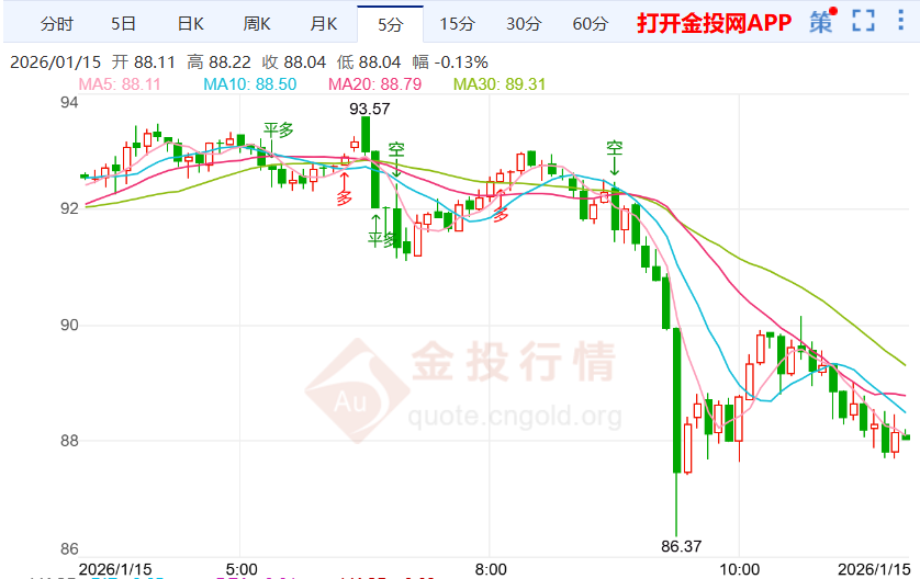 今日周四(1月15日)亚盘时段,国际白银目前交投于88.88一线下方,今日开盘于93.57美元/盎司,截至发稿,国际白银暂报88.21美元/盎司,下跌5.33%,最高触及93.57美元/盎司,最低下探86.37美元/盎司,目前来看,国际白银盘内短线偏向震荡走势。