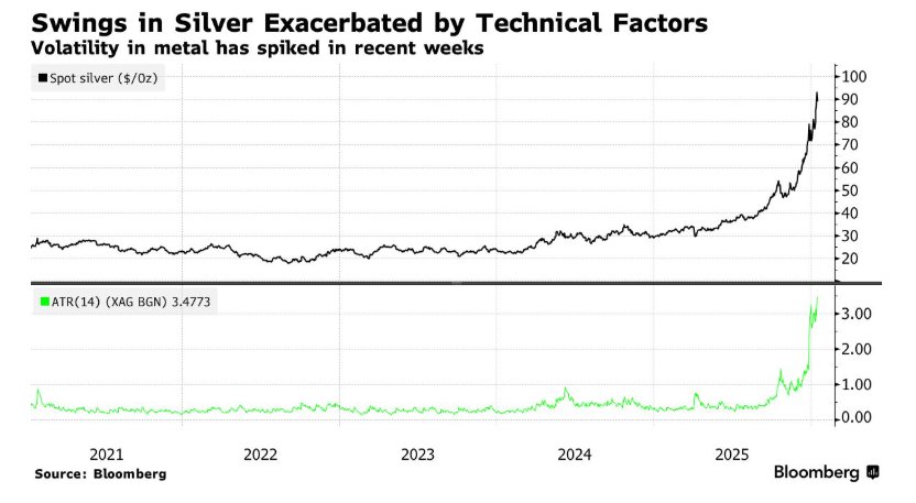 过去几周,白银价格易出现剧烈波动,其14日指数平均真实波幅区间 —— 一个市场波动性衡量指标,在短短几日内迅速飙升。不过这一趋势在很大程度上可能归因于投机资金主导的强劲技术因素,而不是基本驱动因素。