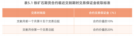 铁矿石期货合约的最低交易保证金为合约价值的5%。交易保证金实行分级管理,随着期货合约交割期的临近,交易所将逐步提高交易保证金比例。