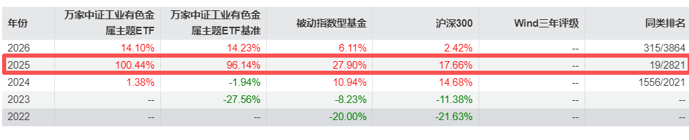 2025年,工业有色ETF(560860)上涨100.44%!较同期基准获4.3%的超额收益,在2821只被动指数基金中,排名19/2821。
