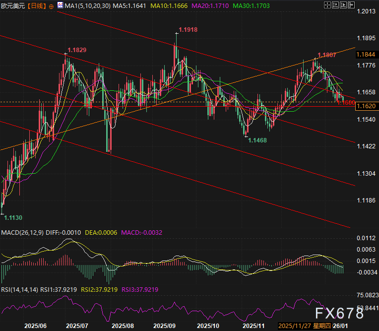 在数据层面,市场焦点已转向纽约联储制造业指数与费城联储制造业报告,这两份数据将验证2025年第四季度美国经济复苏动能,若数据继续向好,有望进一步强化美元强势,推动EUR/USD下探1.1618支撑位;若数据不及预期,欧元或获得喘息机会,迎来技术性反弹。