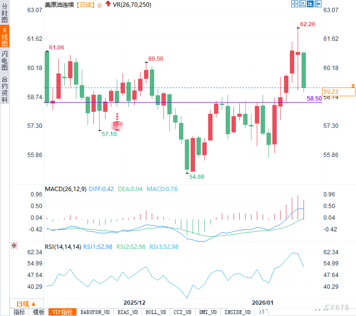 从技术图形看,美原油此前上冲至62.20美元后回落,目前59.23美元正处于前期密集成交区。下方58.50美元一带具备较强支撑意义,一旦跌破,可能引发进一步的技术性抛售;而上方需重新站稳60.20美元并尝试收复前高,才能重启升势。MACD指标显示DIFF为0.42、DEA为0.04、MACD柱为0.76,动能仍偏正面但趋于收敛;RSI(14)约为52.98,处于中性区域,表明市场已从“偏强”转入“均衡”状态,符合“溢价回吐后的震荡整理”特征。