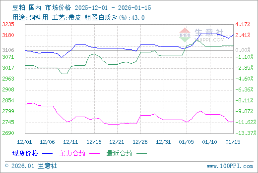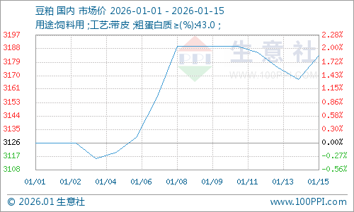 据生意社商品行情分析系统显示:1月初以来,豆粕行情震荡上涨。1月1日,豆粕市场均价3126元/吨,1月15日,豆粕市场均价3184元/吨,价格上涨1.86%。
