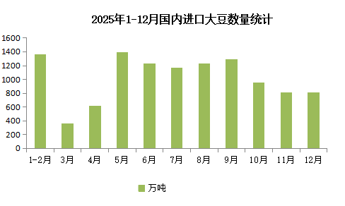 供应:2025年1-12月中国大豆累计进口量为1.12亿吨,同比提高6.5%。其中,12月份中国大豆进口量为804.4万吨,环比减少0.9%。虽然12月原料大豆进口数量有所下滑,但供应压力仍在,豆粕行情上涨空间受限。