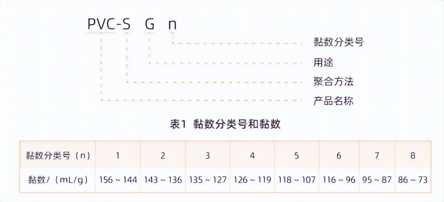 产品分类代码由GB/T 3402.1中规定的产品名称、聚合方法和用途的表示符号及黏数分类号(见表1)等四项组成。聚合方法、用途及黏数分类号组合为产品型号。