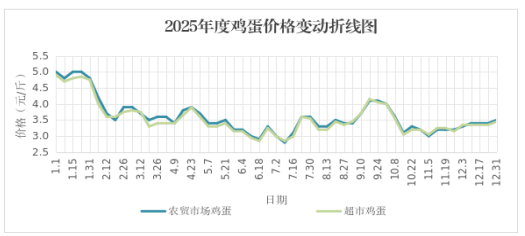 农贸市场鸡蛋价格由2025年1月初5元/斤波动下降,至7月上旬达年度低点2.8元/斤后波动回涨,于9月中旬达下半年度高点4.1元/斤后波动回落,年末达3.5元/斤,较年初下降30%。