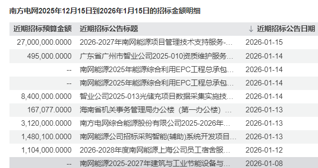 落实到订单层面,国家电网、南方电网近期招标活跃,投资力度连续加大。据不完全统计,2025年12月15日至2026年1月15日期间,南方电网已公布招标预算金额合计为180.32亿元,主要涵盖特高压设备、主网一次设备及智能化装置,特变电工、山东电力设备、上海思源等企业入围金额居前。