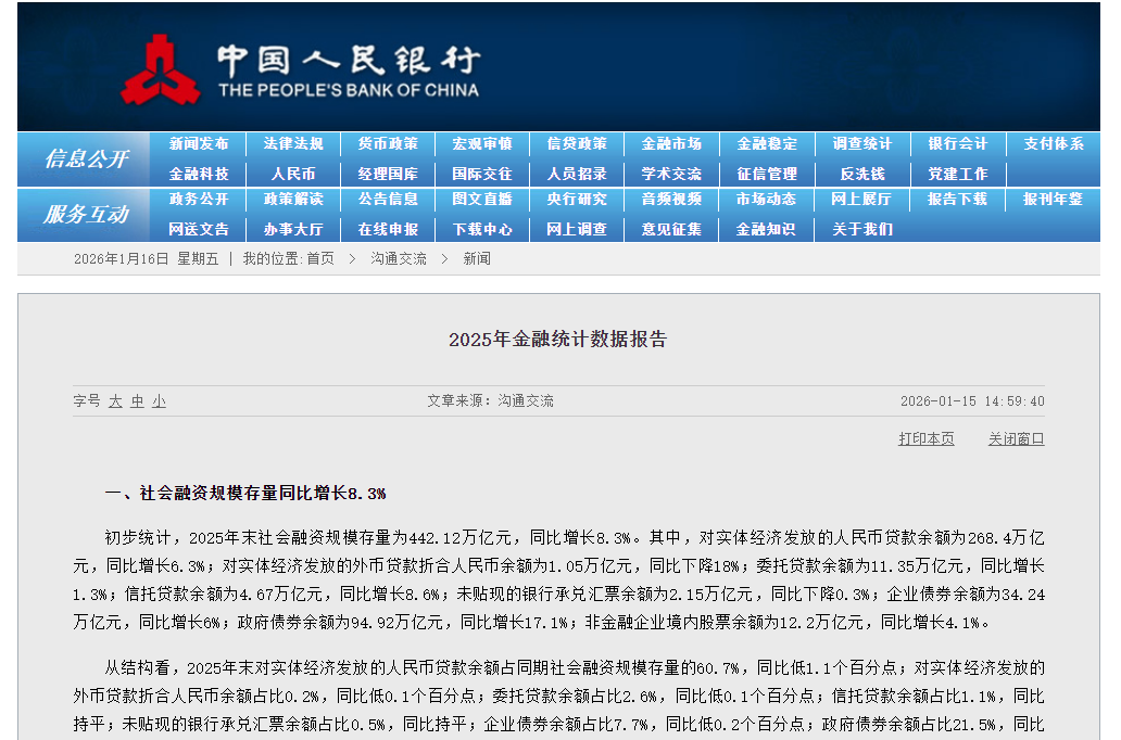 1月15日,中国人民银行发布2025年金融统计数据报告。报告显示,2025年末社会融资规模存量为442.12万亿元,同比增长8.3%。广义货币(M2)、狭义货币(M1)、本外币贷款余额同比分别增长8.5%、3.8%、6.2%。