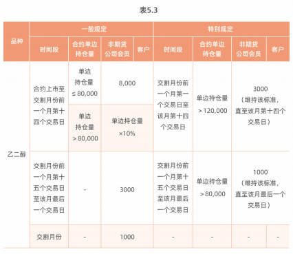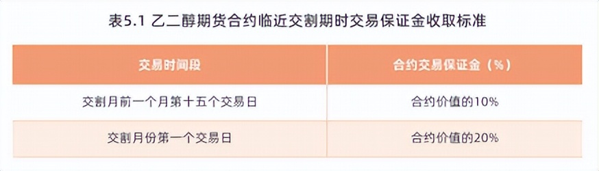 乙二醇期货合约的最低交易保证金为合约价值的5%。交易保证金实行分级管理,随着期货合约交割期的临近,交易所将逐步提高交易保证金比例。