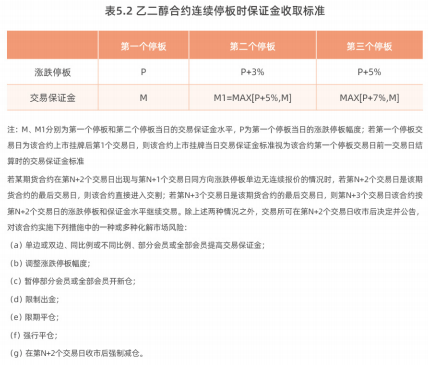 乙二醇合约交割月份以前的月份涨跌停板幅度为上一交易日结算价的4%,交割月份的涨跌停板幅度为上一交易日结算价的6%。当合约出现连续停板时,交易所将提高涨跌停板幅度。
