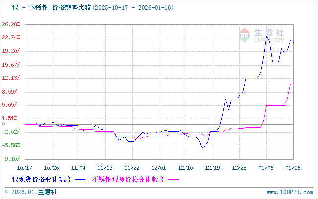 据生意社价差分析工具显示,镍和不锈钢价格走势相似,近期整体走势大幅上涨。