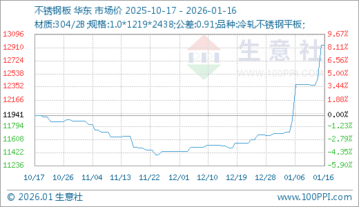 据生意社价格监测,本周不锈钢价格小幅上涨。截止1月16日,现货304/2B不锈钢平板1.0*1219*2438(公差0.91)的日均价为现报价12941.67元/吨,较周初上涨4.58%,同比上涨0.94%。