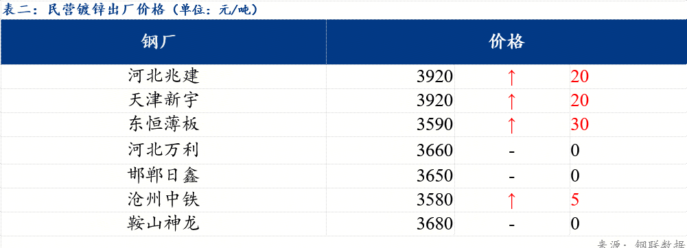 今日北方民营钢厂镀锌出厂指导价在3590-3920元/吨。