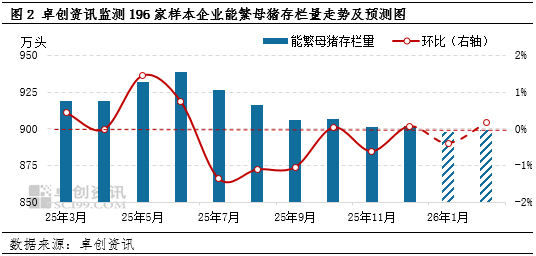 卓创资讯预计2026年生猪养殖收入或同比回落11.57%。养殖收入主要受生猪价格及生猪交易均重影响。从生猪行情来看,2026年生猪供应或较为充沛,猪价有同比回落的可能。由于能繁母猪存栏量影响10个月后的生猪出栏量,因此2025年3月-2026年2月的能繁母猪存栏量影响2026年的生猪供应量。根据卓创资讯监测的样本企业能繁母猪存栏量来看,2025年7月份能繁母猪存栏量开始出现下滑动作,且连续3个月降幅超过1.00%,但此后跌幅较为有限,因此2026年上半年生猪价格或呈现震荡下滑态势,下半年有上涨空间,但受去产能速度较慢的影响,猪价回暖速度或较为缓慢。结合生猪交易均重,卓创资讯预计2026年生猪养殖收入或呈春节前最高、此后快速回落至低位、下半年震荡上涨的趋势。