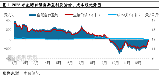 2025年生猪自繁自养盈利呈现上半年较为平稳、下半年先降后回暖的态势。而经过2025年12月末的快速反弹后,自繁自养模式在1月中旬再度迎来微幅盈利的情况。就当前的最新产能情况来看,2026年生猪行情虽仍可能呈先跌后涨态势,但转折点或再度推后,下半年上涨幅度亦或受限。在猪价的影响下,生猪自繁自养盈利或在盈亏线附近徘徊,年末或再度回归至盈利状态。