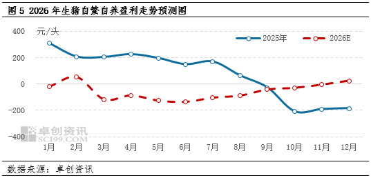 养殖收入及养殖成本均有下滑空间,但养殖收入降幅大于成本降幅,因此对养殖利润而言仍属于利空表现。根据卓创资讯预计,2026年生猪自繁自养盈利或呈下降态势,年均值预计在-(50-70)元/头之间,同比回落120-140元/头。