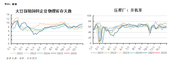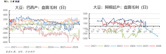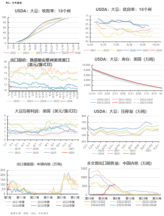 国际来看,根据USDA报告1月份数据显示,2025/2026年度期末库存较2024/2025年度增量101万吨,大豆供应格局宽松格局加剧。美国内需旺盛、外需现实偏弱状态延续,在“低外需”的背景下,美豆农或难以实现可观的种植收益,在此背景下,中国能否实现“未来三年每年采购美豆2500万吨”的预期和中美贸易氛围能否得到进一步缓和,成为决定美豆农种植利润的关键因素;巴西方面,目前土壤虽偏干,但天气条件整体尚可,1月份USDA报告进一步调升巴西大豆产量300万吨,同时也调升了150万吨的出口,虽然预期供应压力增大,但强劲的出口需求或对巴西大豆升贴水产生较强支撑,后续需关注巴西大豆产区天气变化情况和中国的买船情况。