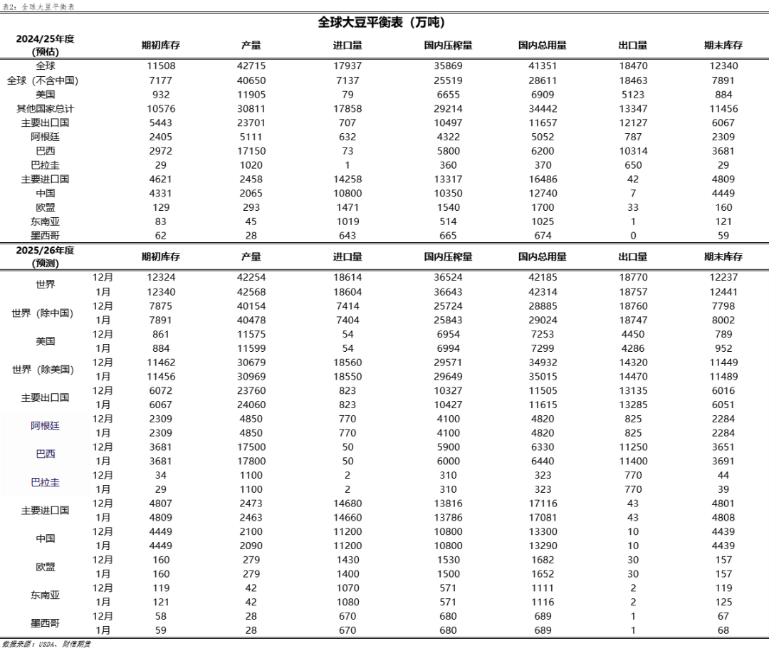 7、USDA大豆报告整体利空、全球大豆期末库存上调,主要巴西上调产量和出口需求,但期末库存整体仍然增加100万吨,25/26年度供应压力仍大。