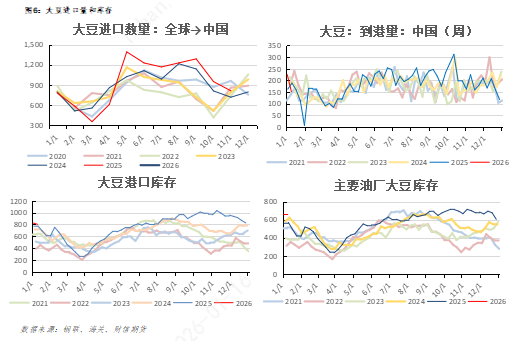 1、大豆到港和库存:根据海关数据显示,12月份我国大豆进口量约804.4万吨,2025年中国大豆累计进口量达到1.11833亿吨,同比增长6.5%。