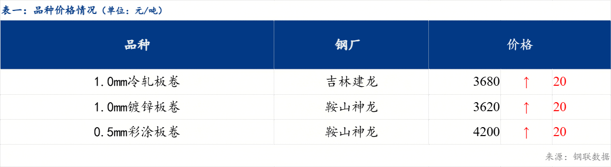 现东北主流市场冷轧镀锌价格小幅下跌,沈阳市场冷轧板卷价格3680元/吨,较昨日上涨20元/吨,镀锌板卷价格3620元/吨,较昨日上涨20元/吨, 彩涂板卷价格4180元/吨,较昨日上涨20元/吨。具体来看,市场方面,今日热卷期货盘面偏强运行,市场冷镀价格跟涨,但今日市场交投氛围较冷清,成交依旧以刚需为主。心态方面,近期虽受宏观政策加市场看涨情绪影响,但由于市场需求严重不足,贸易商冬储意愿仍然弱,操作依旧以出货回笼资金为主。综合来看,预计下一交易日东北市场冷轧及镀锌板卷价格或震荡运行为主。