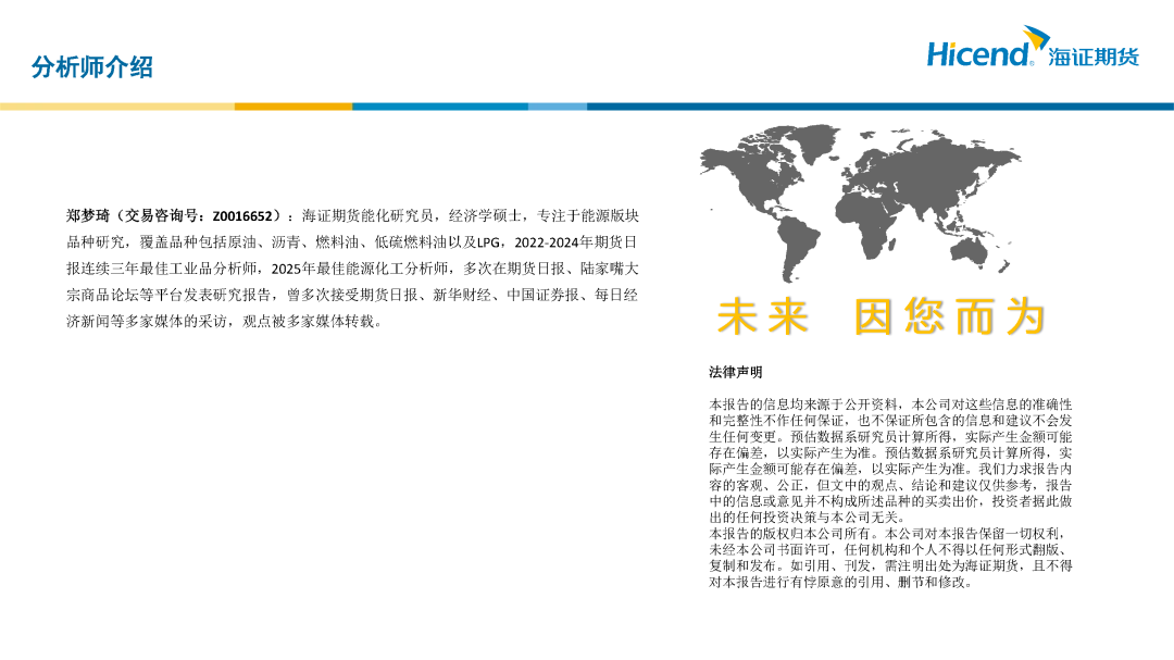 郑梦琦(交易咨询号:Z0016652):海证期货能化研究员,经济学硕士,专注于能源版块品种研究,覆盖品种包括原油、沥青、燃料油、低硫燃料油以及LPG,期货日报第十五届、第十六届最佳工业品分析师,多次在期货日报、陆家嘴大宗商品论坛等平台发表研究报告,曾多次接受期货日报、新华财经、中国证券报、每日经济新闻等多家媒体的采访,观点被多家媒体转载。