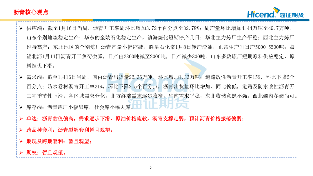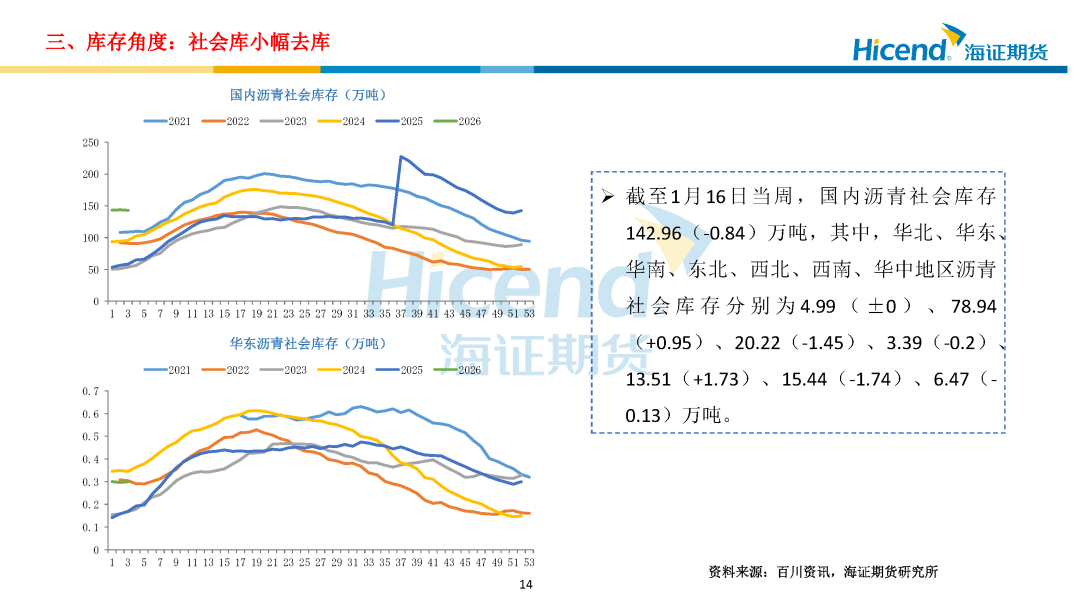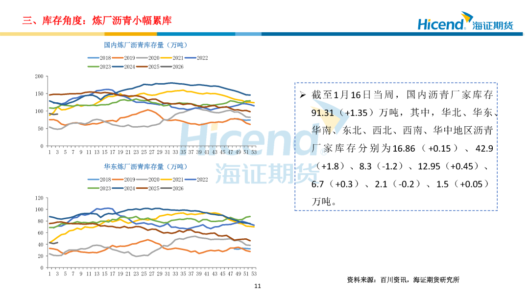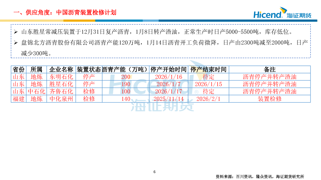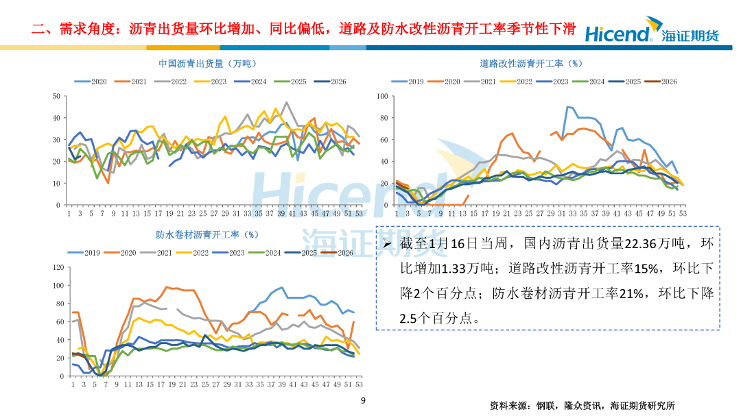 需求端:截至1月16日当周,国内沥青出货量22.36万吨,环比增加1.33万吨;道路改性沥青开工率15%,环比下降2个百分点;防水卷材沥青开工率21%,环比下降2.5个百分点,沥青出货量环比增加、同比偏低,道路及防水改性沥青开工率季节性下滑。各区域需求分化,北方终端需求逐步收窄,华南需求平稳,东北收储意愿不强,西北疆内冬储尚可。
