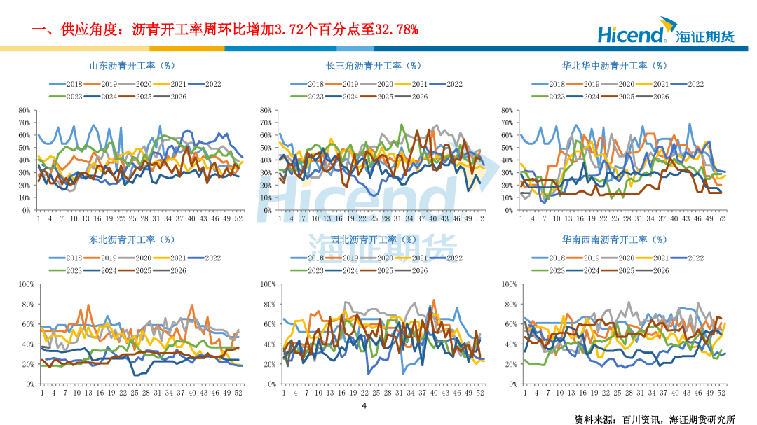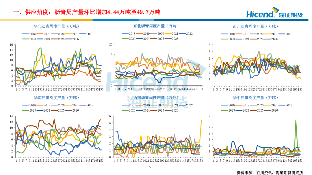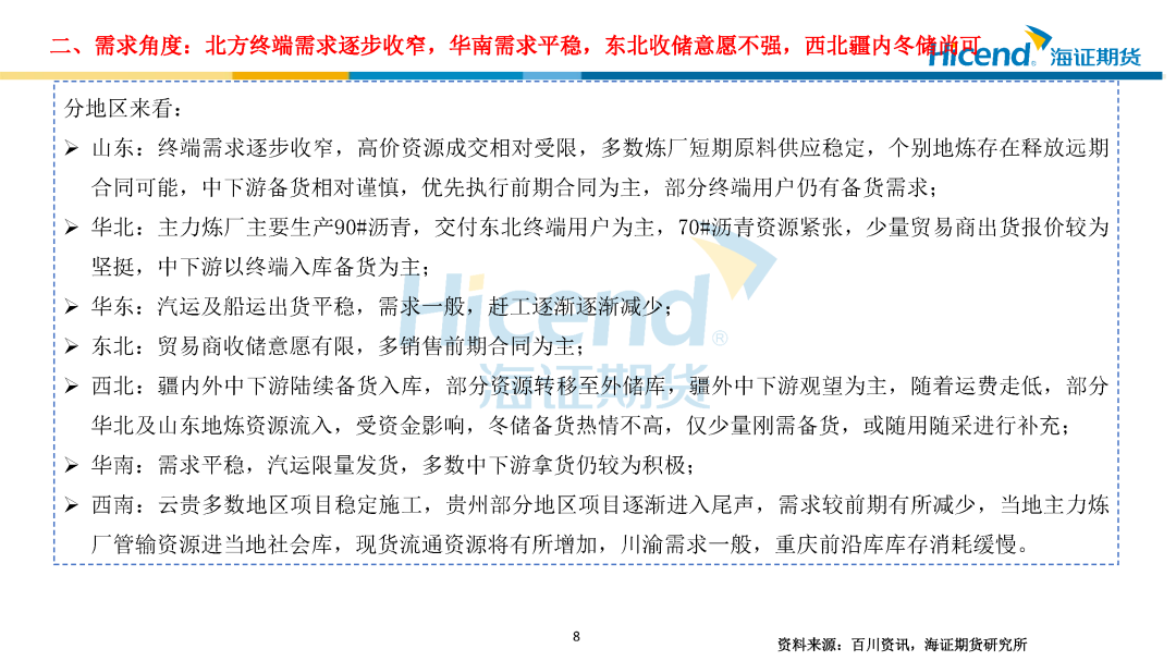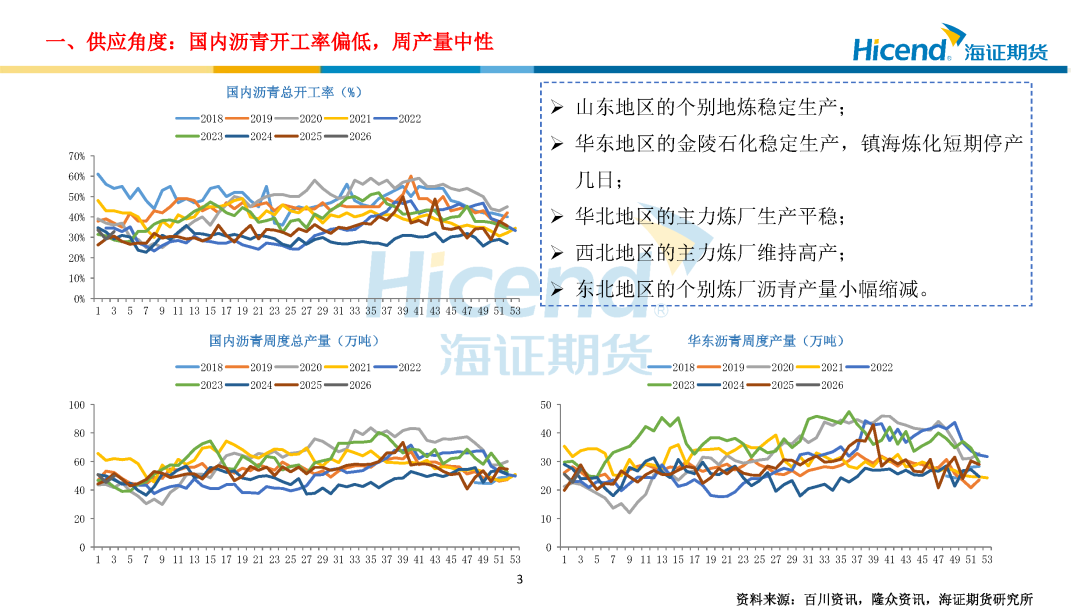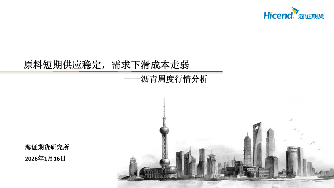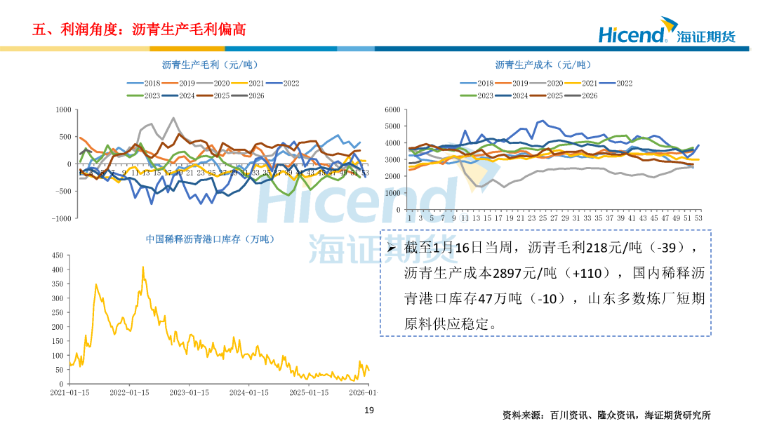 需求端:截至1月16日当周,国内沥青出货量22.36万吨,环比增加1.33万吨;道路改性沥青开工率15%,环比下降2个百分点;防水卷材沥青开工率21%,环比下降2.5个百分点,沥青出货量环比增加、同比偏低,道路及防水改性沥青开工率季节性下滑。各区域需求分化,北方终端需求逐步收窄,华南需求平稳,东北收储意愿不强,西北疆内冬储尚可。