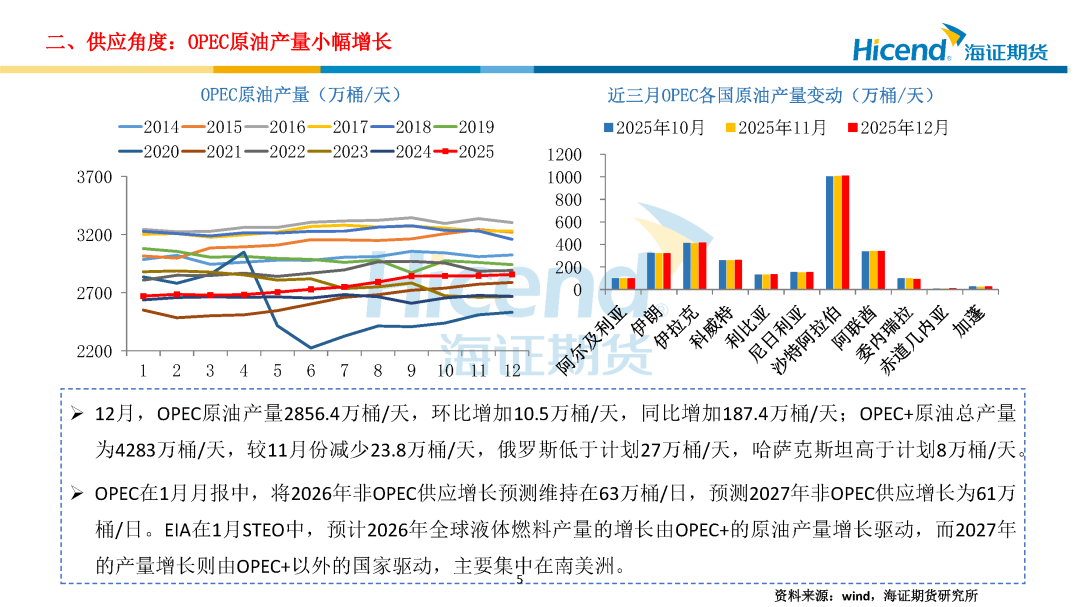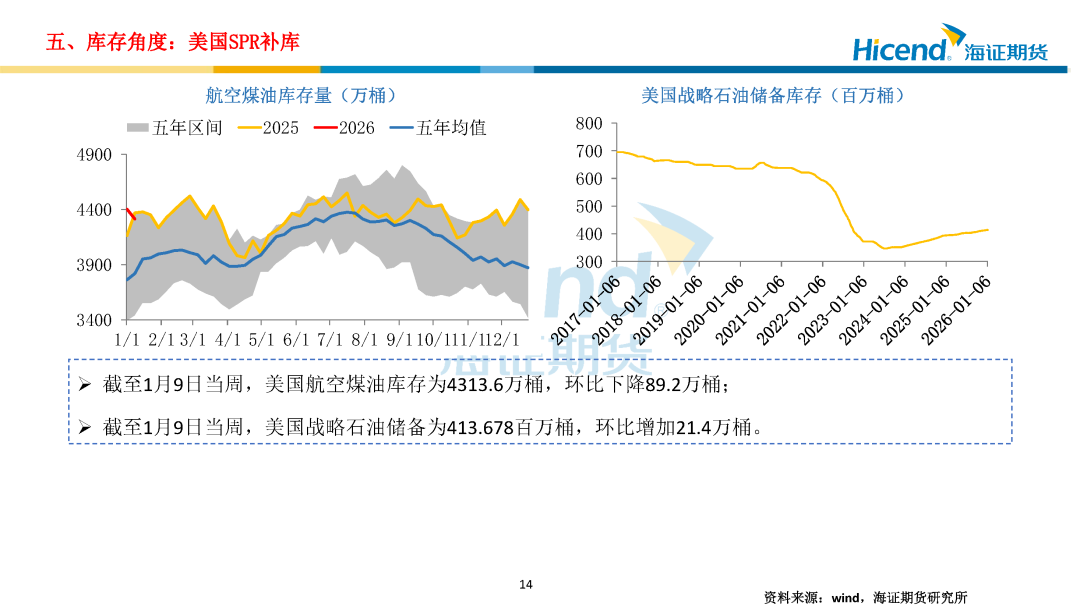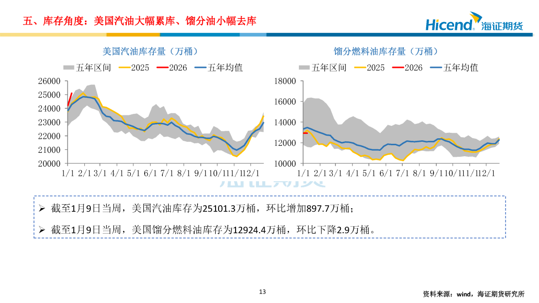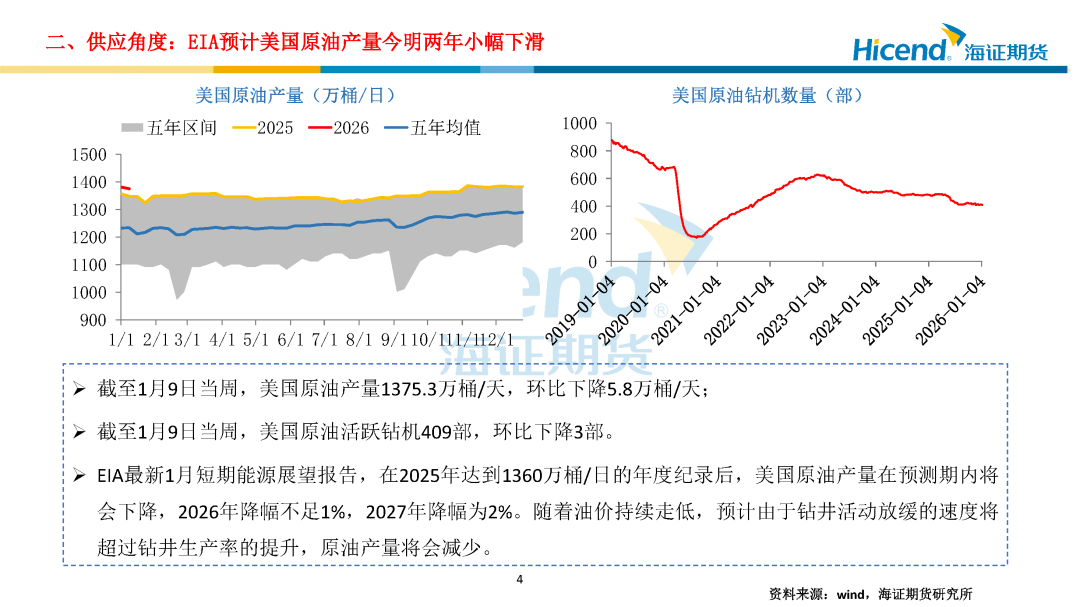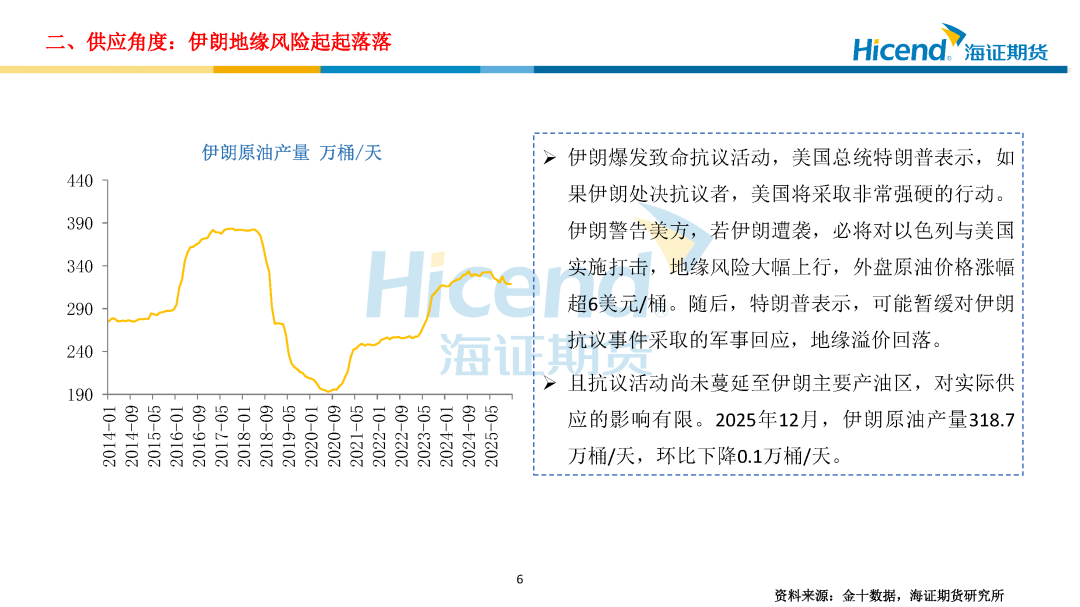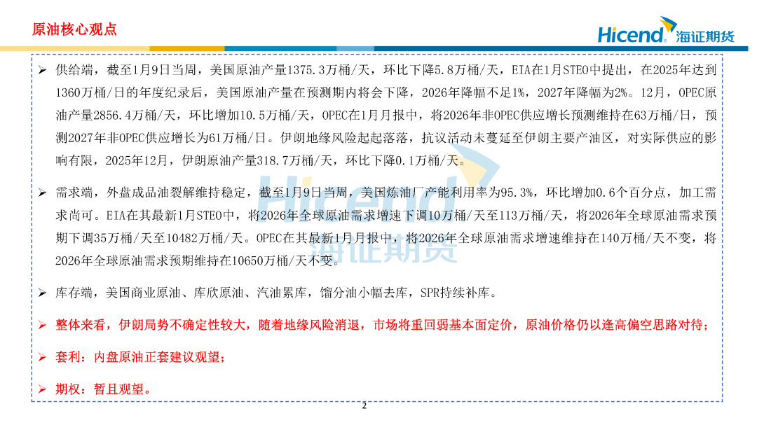供给端,截至1月9日当周,美国原油产量1375.3万桶/天,环比下降5.8万桶/天,EIA在1月STEO中提出,在2025年达到1360万桶/日的年度纪录后,美国原油产量在预测期内将会下降,2026年降幅不足1%,2027年降幅为2%。12月,OPEC原油产量2856.4万桶/天,环比增加10.5万桶/天,OPEC在1月月报中,将2026年非OPEC供应增长预测维持在63万桶/日,预测2027年非OPEC供应增长为61万桶/日。伊朗地缘风险起起落落,抗议活动未蔓延至伊朗主要产油区,对实际供应的影响有限,2025年12月,伊朗原油产量318.7万桶/天,环比下降0.1万桶/天。
