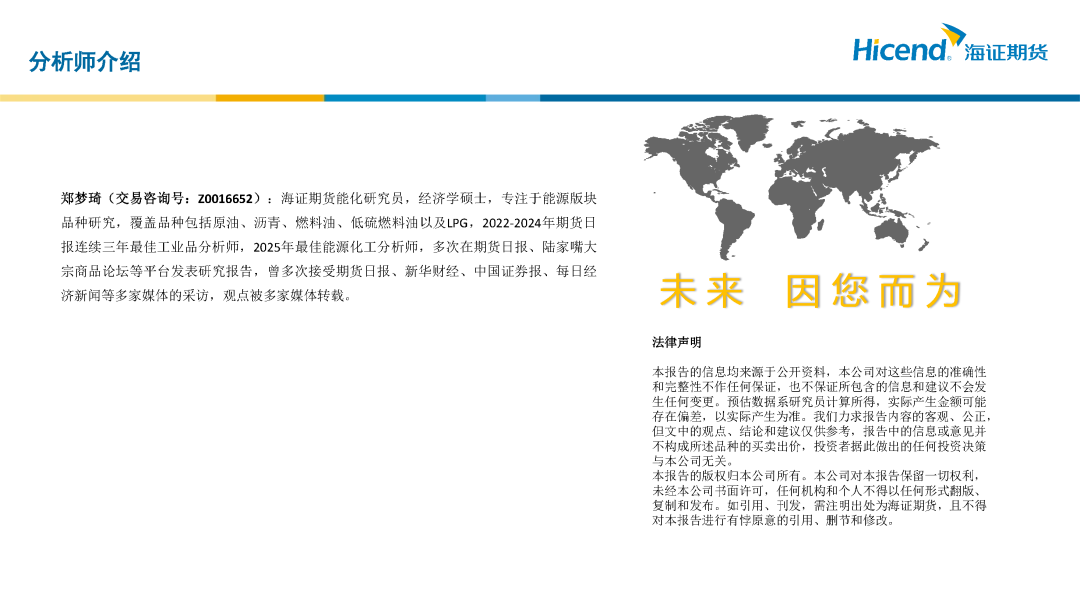 郑梦琦(交易咨询号:Z0016652):海证期货能化研究员,经济学硕士,专注于能源版块品种研究,覆盖品种包括原油、沥青、燃料油、低硫燃料油以及LPG,期货日报第十五届、第十六届最佳工业品分析师,多次在期货日报、陆家嘴大宗商品论坛等平台发表研究报告,曾多次接受期货日报、新华财经、中国证券报、每日经济新闻等多家媒体的采访,观点被多家媒体转载。