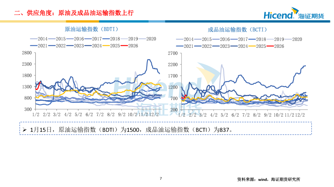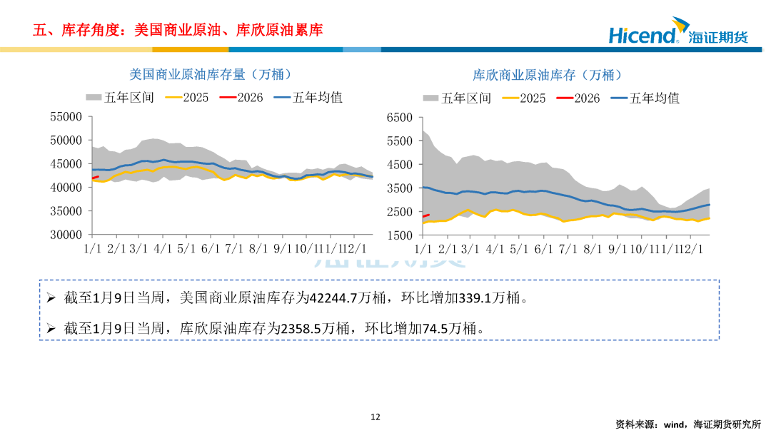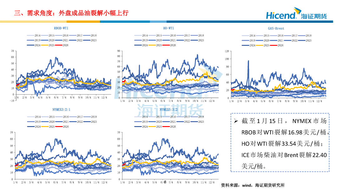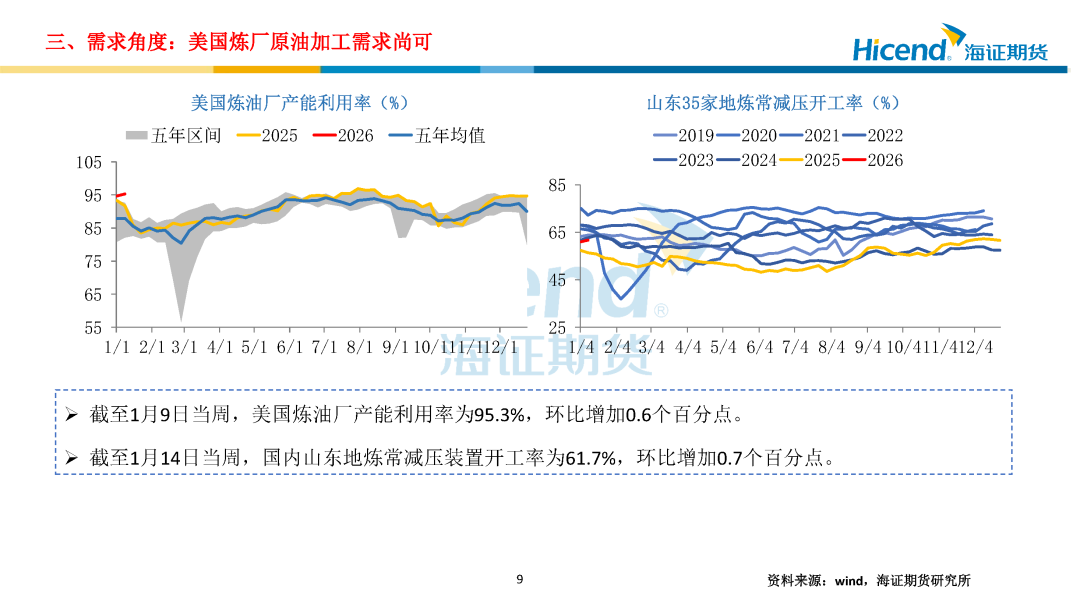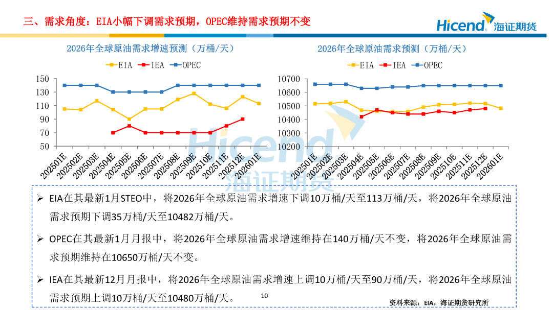 需求端,外盘成品油裂解维持稳定,截至1月9日当周,美国炼油厂产能利用率为95.3%,环比增加0.6个百分点,加工需求尚可。EIA在其最新1月STEO中,将2026年全球原油需求增速下调10万桶/天至113万桶/天,将2026年全球原油需求预期下调35万桶/天至10482万桶/天。OPEC在其最新1月月报中,将2026年全球原油需求增速维持在140万桶/天不变,将2026年全球原油需求预期维持在10650万桶/天不变。