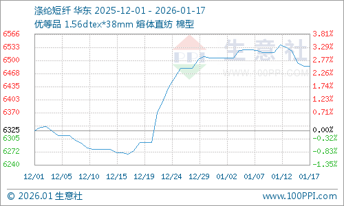 据生意社商品行情分析系统,本周(1月12-17日)涤纶短纤市场行情下跌,截止1月17日国内涤纶短纤(1.4D*38mm)市场均价在6486元/吨,较周初下跌0.8%。