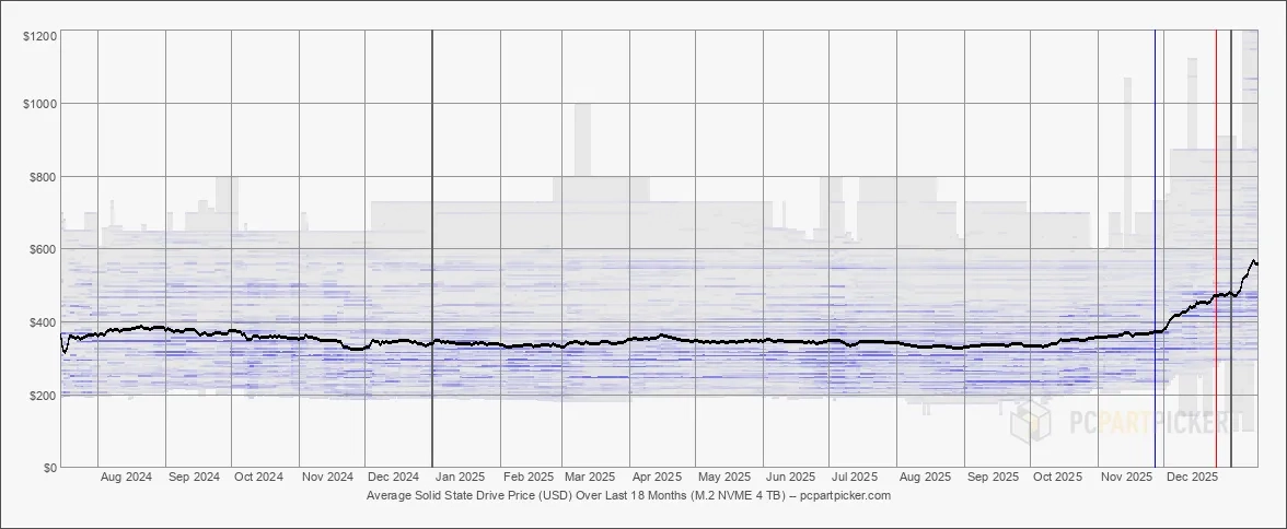 PCPartPicker的价格追踪曲线清晰地展示了这一趋势:过去两个月内,4TB SSD的价格出现了剧烈攀升。图表中价格分布范围的扩大(灰色区域),暗示着旧价格体系下的库存正在逐渐消失。