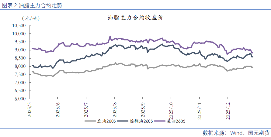 【棕榈油】MPOB报告偏空,马来12月棕榈油库存环比增7.58%至高位,产量高于预期,累库压力显现。产地供需边际改善,马来季节性减产深化,印尼产量增长但非法种植园整顿抑制中长期供应。印尼取消B50政策利空需求,3月起上调出口税则短期利好出口。连棕价格先扬后抑,预计短期多空因素交织,累库与政策利空压制上行,减产及出口税调整形成支撑,但产地供需边际变化忧虑仍存,限制上方空间。