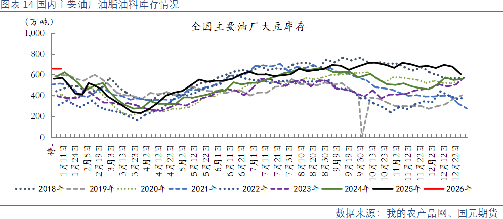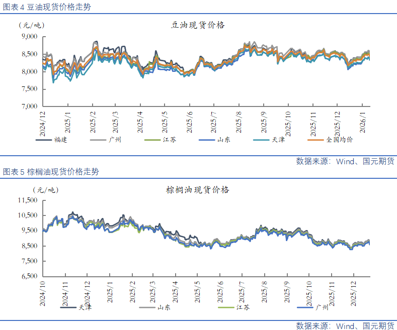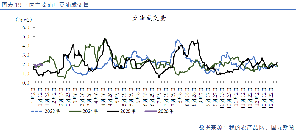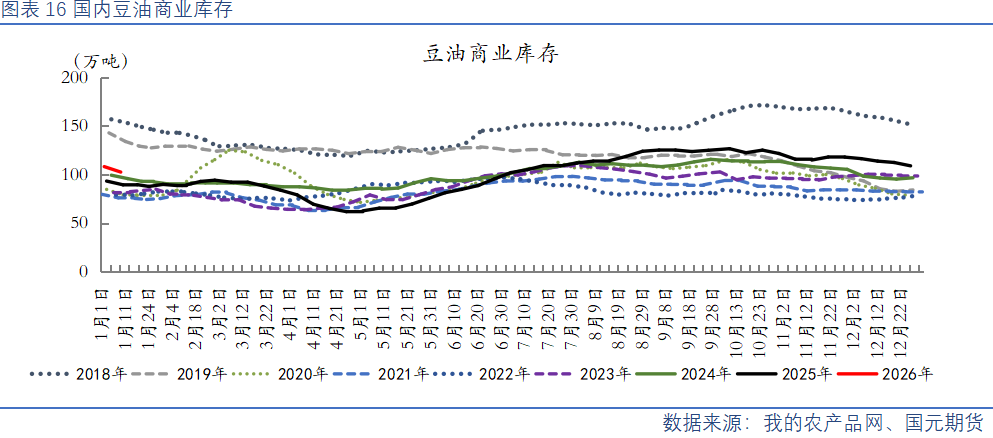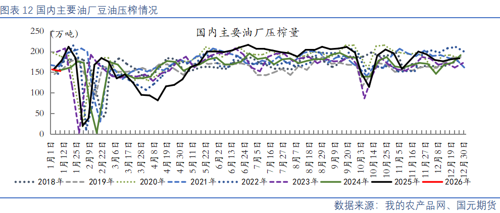 【豆油】美农1月报告中性偏空,上调全球豆油期末库存,强化供应宽松预期。国内供应端大豆压榨量高位支撑豆油产出,库存虽连续去化但仍处同期偏高水平;需求端节前小包装油备货启动,消费温和复苏但力度不及预期。预计全球供应宽松与国内备货需求博弈延续,供需紧平衡难改,预计价格维持震荡运行,上下空间有限。