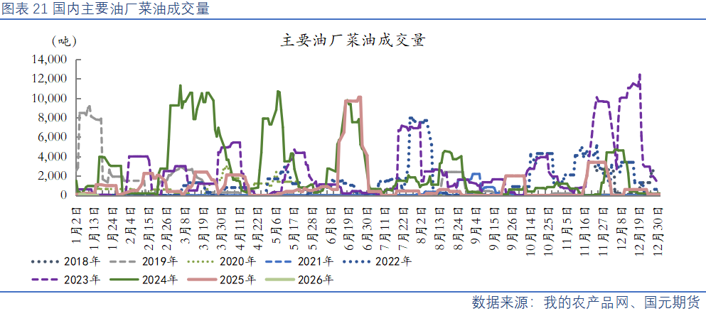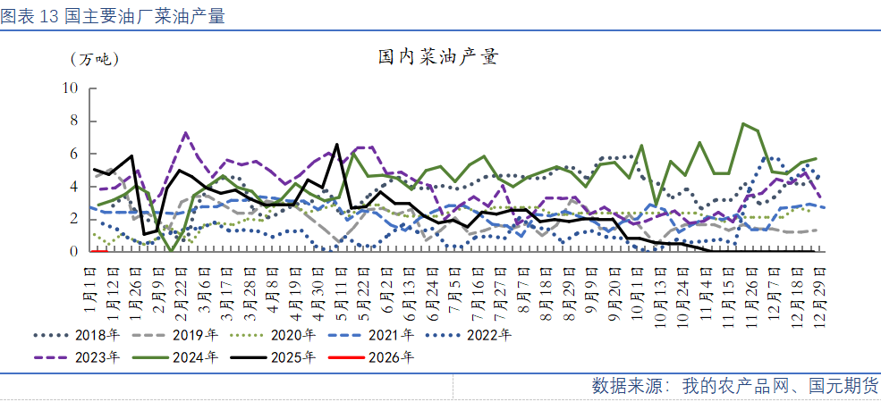 【菜油】油脂月度供需报告偏空拖累菜籽油盘面。中加贸易关系缓和预期升温,市场提前定价加拿大菜籽进口恢复,压制价格上行。产地方面,加菜籽供需宽松,澳籽到港逐步增加;国内油厂停机导致供应趋紧、库存持续去库,但需求端春节备货力度不足,且受豆油替代挤压。价格震荡收跌,预计短期现货偏紧与远期供应宽松预期博弈延续,预计维持震荡偏弱态势。