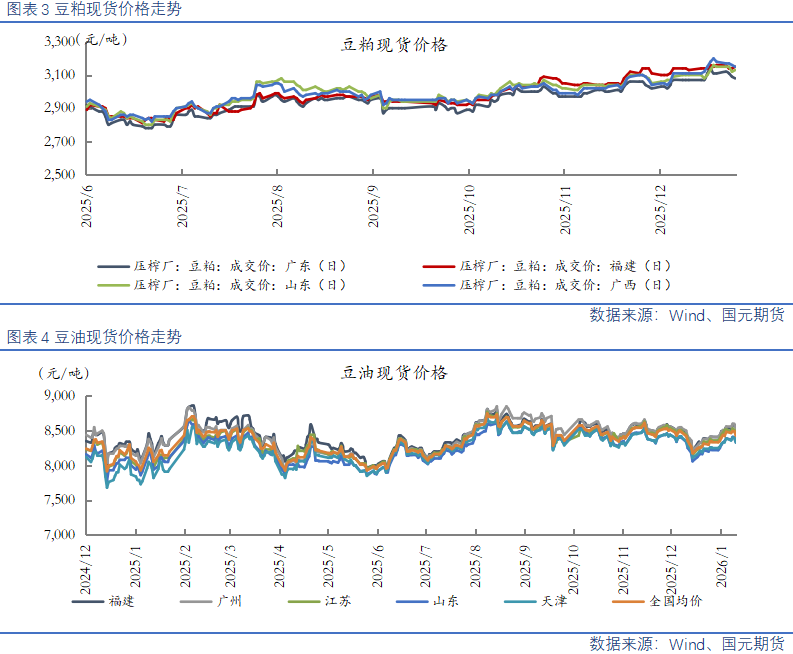 【豆粕】美农1月报告中性偏空,上调美豆产量、下调出口预估,上调巴西大豆产量预期,强化全球供应宽松预期。国内供应端,国储大豆拍卖成交火爆,港口库存高位,整体宽松但油厂开机率偏低致局部偏紧;需求端节前备货带动远月基差成交放量。整体来看,豆系国内外供需博弈延续,全球宽松预期压制价格,但国内成本与补库需求形成支撑,预计维持偏弱震荡态势。