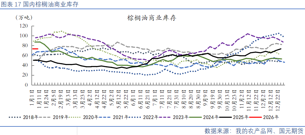 【MPOB:12月底马来西亚棕榈油库存升至近七年最高值远超预期】马来西亚棕榈油局(MPOB)月度数据显示,12月底马来西亚棕榈油库存高达305万吨,环比增长7.58%,创下2019年2月以来的最高水平,远超市场预期。12月份毛棕榈油产量183万吨,环比下降5.46%;出口量131.7万吨,环比增长8.5%。2025年全年棕榈油产量首次突破2000万吨关口,达2028万吨,同比增长4.9%。