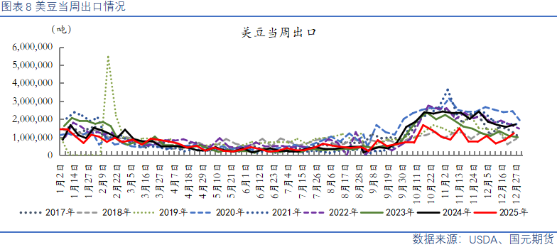 【出口检验:上周美国大豆出口检验量153.0万吨同比增长13%】美国农业部出口检验报告显示,截至2026年1月8日当周,美国大豆出口检验量153.0万吨,同比增长13%,此前一周修正为98.4万吨。2025/26年度迄今出口检验量1793.5万吨,同比减少42.8%,达到全年出口目标4286万吨的41.8%。