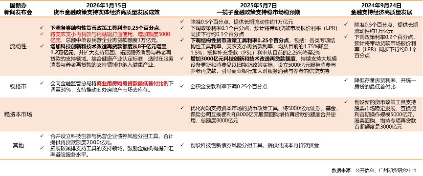 1月15日,央行相关负责人在国新办新闻发布会宣布将下调各类结构性货币政策工具利率以及提高再贷款额度等,打响2026年货币政策头号枪。与2025年5月一揽子金融政策相比,本次总量型货币政策工具缺席,主要为结构性工具发力,一是结构性工具利率下调0.25个百分点与上次相同,结合当前余额约5.26万亿元计算则节约利息约135亿元,二是新增支农支小再贷款额度,继续增加科技创新和技术改造再贷款额度,实际成本节约效果取决于额度使用情况,此外房地产方面首次下调商用房首付,不过商用房销售占比小,更多是稳预期作用。整体而言本次政策力度温和,支持方向符合政策导向。