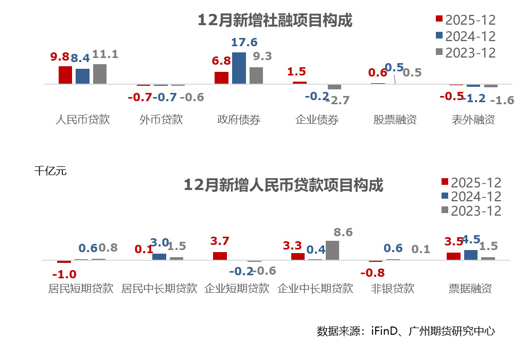 12月新增人民币贷款9100亿元元,同比少增800亿元。居民端继续走弱,短端贷款同比多减,中长期贷款同比少增,与购物节表现一般、房地产销售持续走弱相应,企业端明显改善,短期及中长期均出现同比多增,显示政策托底效果,此外票据融资亦处较高水平,显示年底冲量诉求。
