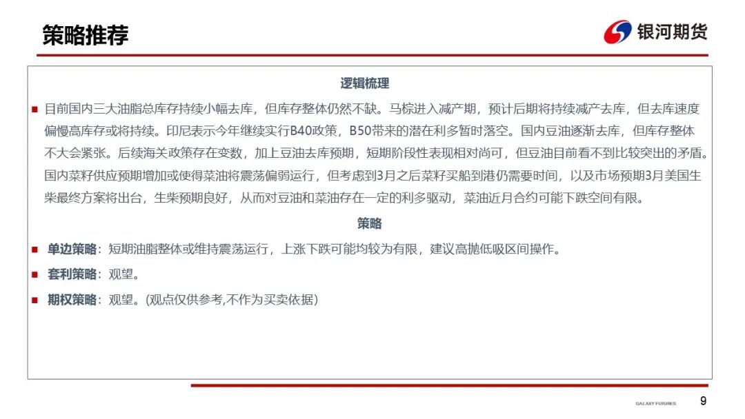 昨日BMD假日休市, CBOT大豆收盘下跌,周三USDA和MPOB将公布月度供需报告,市场平均预估单产将上调至52.5蒲/英亩。作物生长报告显示截至9月9日当周美豆优良率上调2%至68%。豆油周二现货报价略上涨,基差稳定,市场整体成交偏清淡,下游买家多维持观望。棕油震荡行情,建议观望为主。周二现货价格稳中略涨,另外受累于套盘利润表现欠佳,近期未见新增棕榈油买船。不过到港量渐多令9月份棕榈油将保持增库存趋势。菜油现货近两周远月基差合同相对偏多,贸易商为主要补货主体,华南油厂开机率下滑,预计本周华...