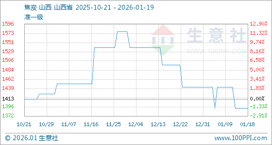 1月19日,生意社焦炭基准价为1391.25元/吨,与本月初(1442.50元/吨)相比,下降了3.55%。