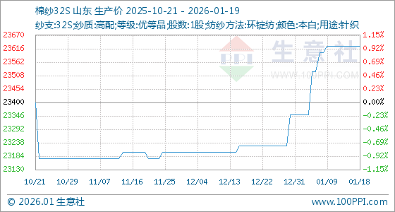 1月19日,生意社棉纱32S基准价为23625.00元/吨,与本月初(23350.00元/吨)相比,上涨了1.18%。