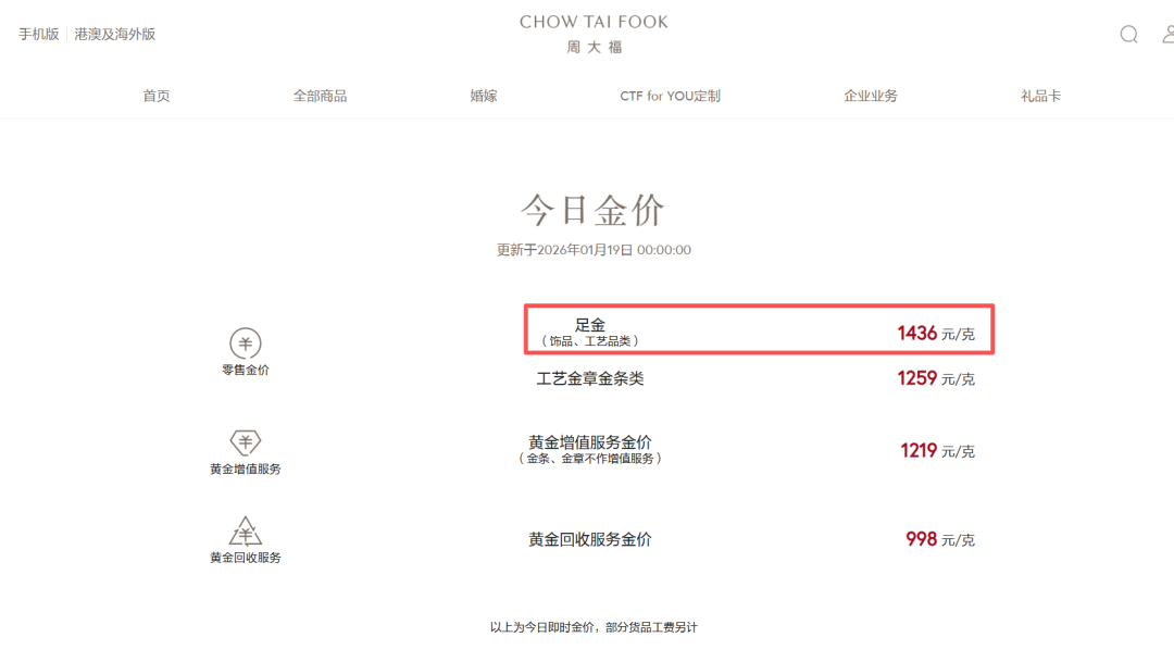 金饰价格同样居高不下。截至发稿,周大福足金饰品价格报1436元/克,周生生为1429元/克,均处于近期高位。