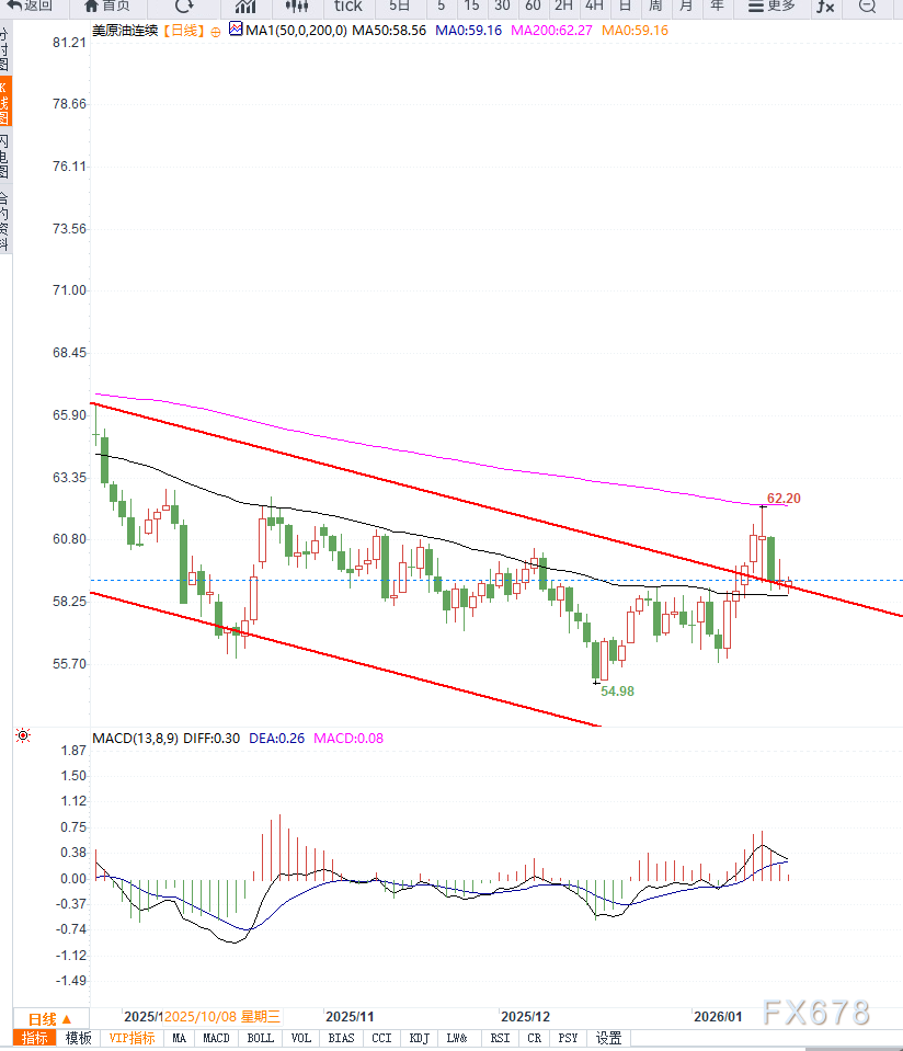 上周油价在短暂突破后迅速回落并收出大阴线,说明反弹更多属于技术性修复,而非趋势反转。短期均线已出现转弱信号,5日均线拐头向下并接近下穿10日均线,中期20日均线仍位于60美元上方,对价格构成动态压制。