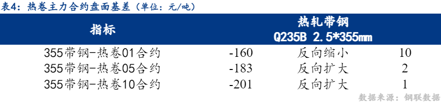 13日市场热卷05合约与唐山355带钢价差反向扩大2元/吨,热卷10合约与唐山355带钢价差反向扩大1元/吨。