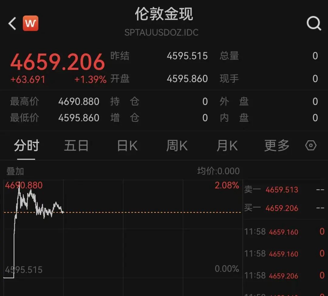 截至发稿,现货黄金涨逾1%,盘中一度涨至4690美元/盎司附近,现货白银涨超3%。